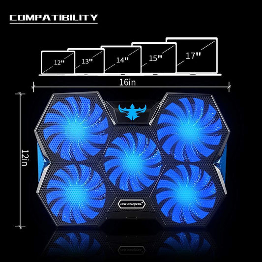 Gaming Laptop Fan Cooling Pad with 5 Big Cooling Fans, Laptop Cooler Cooling Pad for Laptop 15-17 Inch, Strong Wind Fast Heat Dissipation, the Wind Speed Adjustable, Two USB Ports